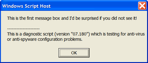 After the "first" message shown above the script attempts to do things that may trigger an AntiVirus or AntiSpyware program activity. If triggered you may see a popup (from the Anti-Virus program) or it may silently kill this script and so you will not see any or all of the message boxes.